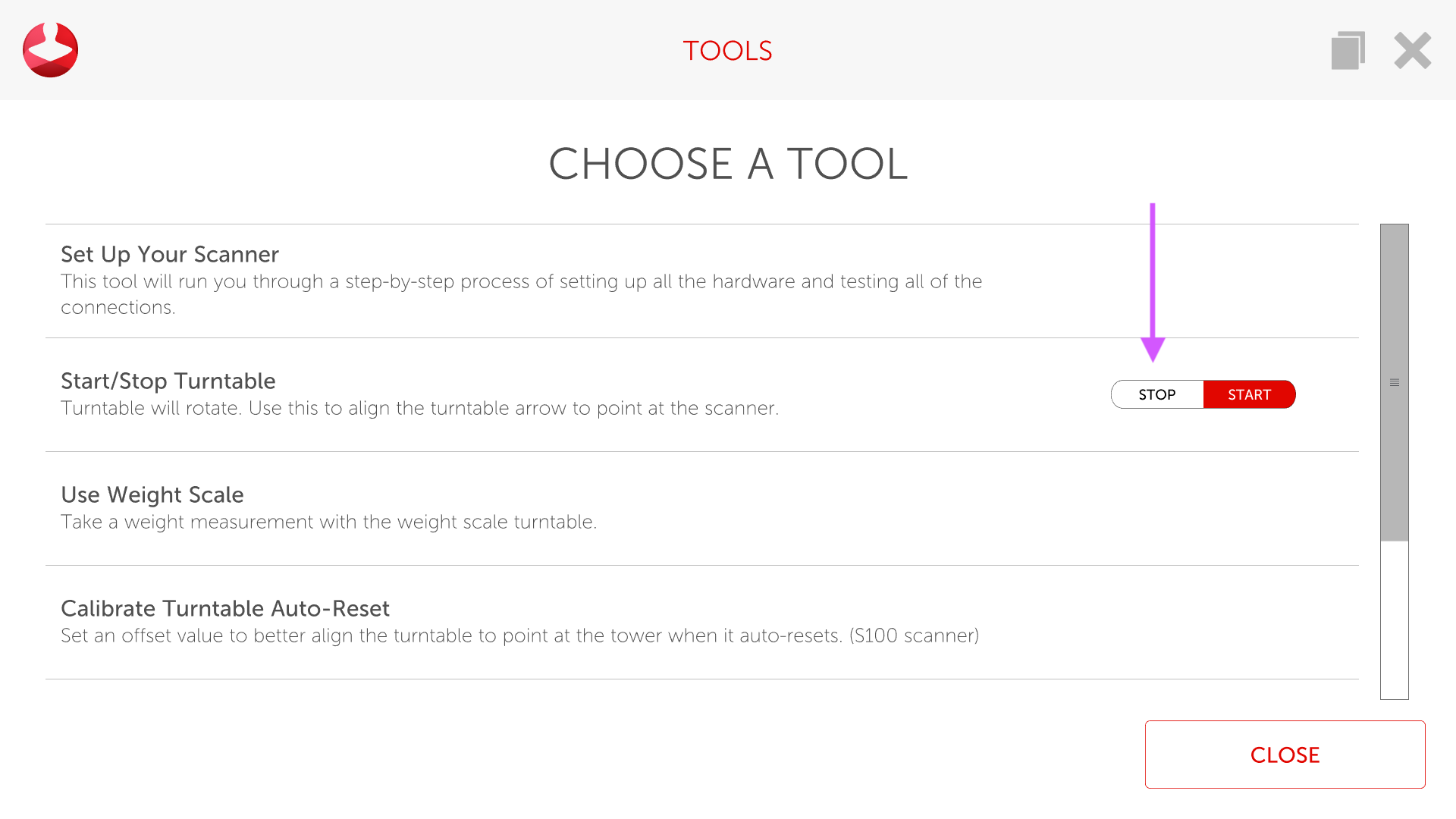 Step 3: Once the turntable arrow is pointing at the scanning tower, press the Stop button.